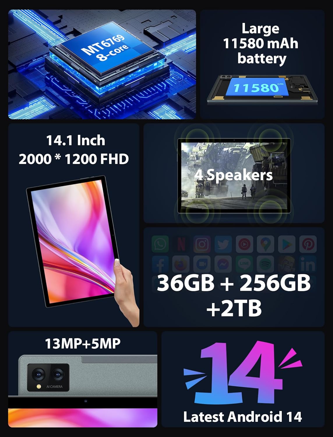 【Unleash Productivity with Powerhouse Performance】➤ 14 inch tablet with 36GB RAM (12GB+24GB)+256GB ROM and 8-core 2.0GHz CPU. The Mali-G52 GPU,FCC/CE-certified device and a 12nm process for reliability.The Android 14 tablet handles 2-window split-screen effortlessly—draft docs, host video calls.100% sRGB IPS display with 2K ensures pixel-perfect edits. Say goodbye to lag, hello to efficiency!