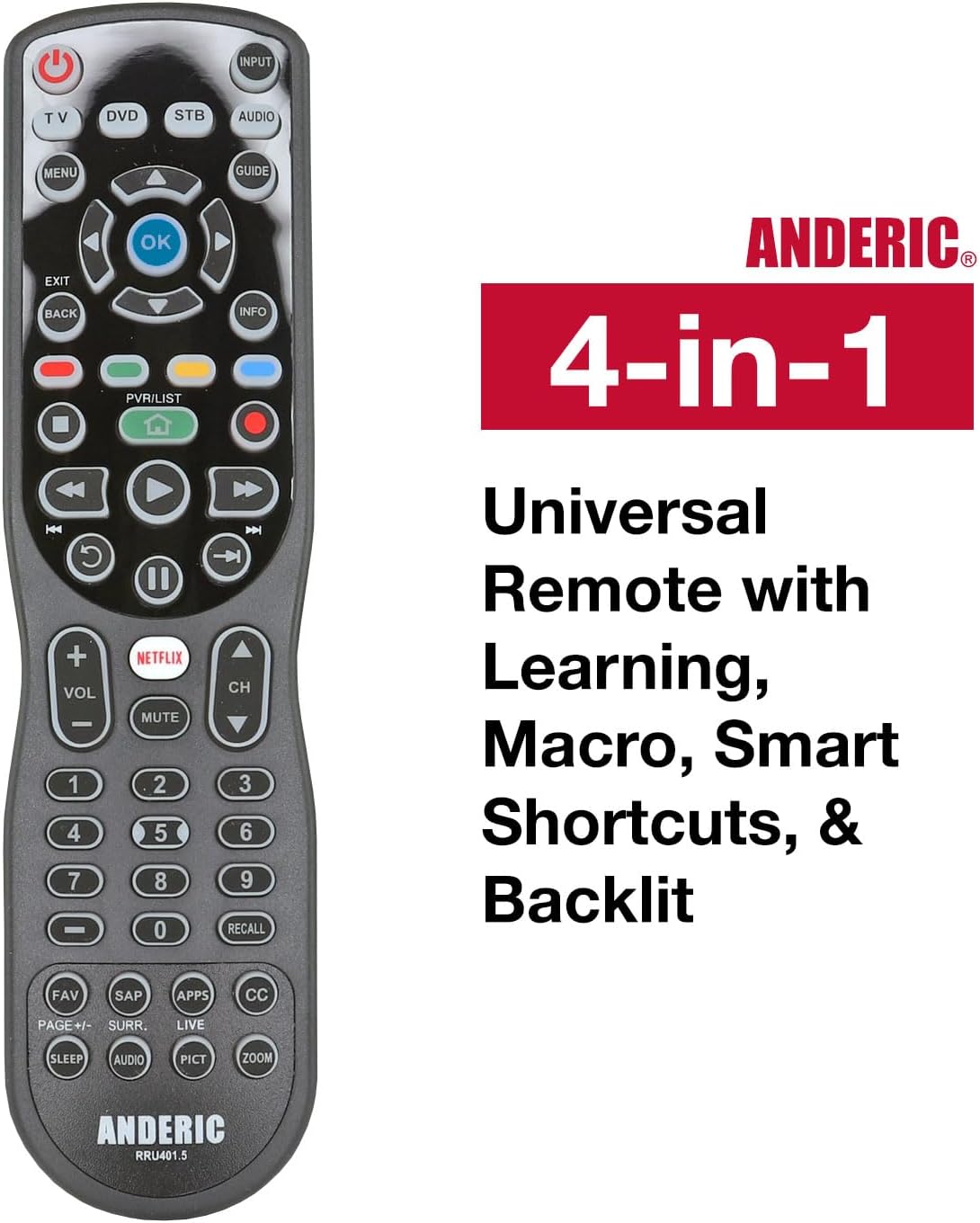 4-in-1, 4-Device IR Universal Remote Control with Macro, Learning, Backlit, Netflix Apps Keys for All TVs, Streaming Players, BluRay Player, Audio, Cable, Roku, Apple TV and More – Anderic RRU401