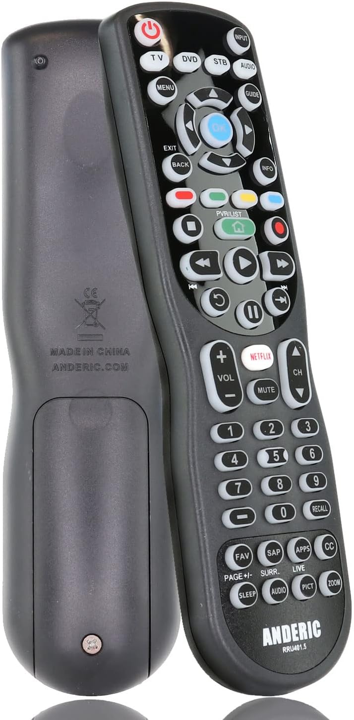 The Anderic 4-IN-1 Universal Remote Control is an excellent device for consolidating up to 4 remotes into one for all your home entertainment needs. You can program the 4-device universal remote to work with most brands by following the instructions provided. It comes with TV, DVD, STB, and AUDIO modes, which you can program for use with up to 4 devices. The remote also features popular functions like APPS (if applicable), CC, Sleep, Menu, and all other necessary buttons for normal operations.