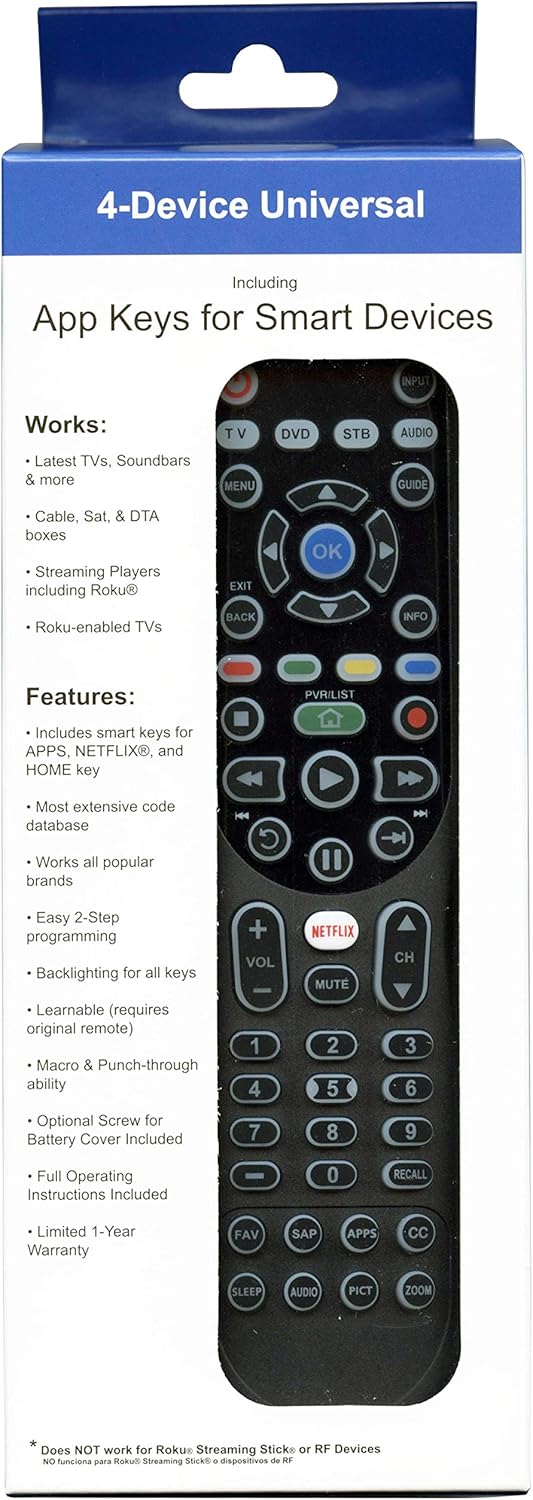 High-strength IR signals Netflix shortcut keyOperates up to 4 Devices Extensive code database Works DirecTv and more Roku TVs along with all other major brandsBacklit keys automatically illuminate when keys are pressedUse our “Code lookup tool” to easily program your remote with key diagrams (see instructions provided)