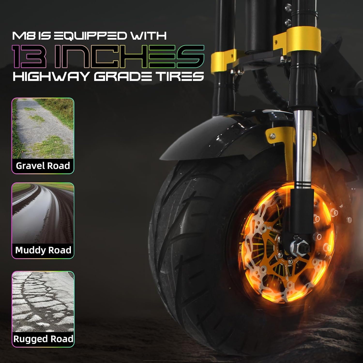 OFF-ROAD Electric Scooters: 13-inch all-terrain tires provide superior traction and stability across various surfaces, perfect for both urban and off-road adventures