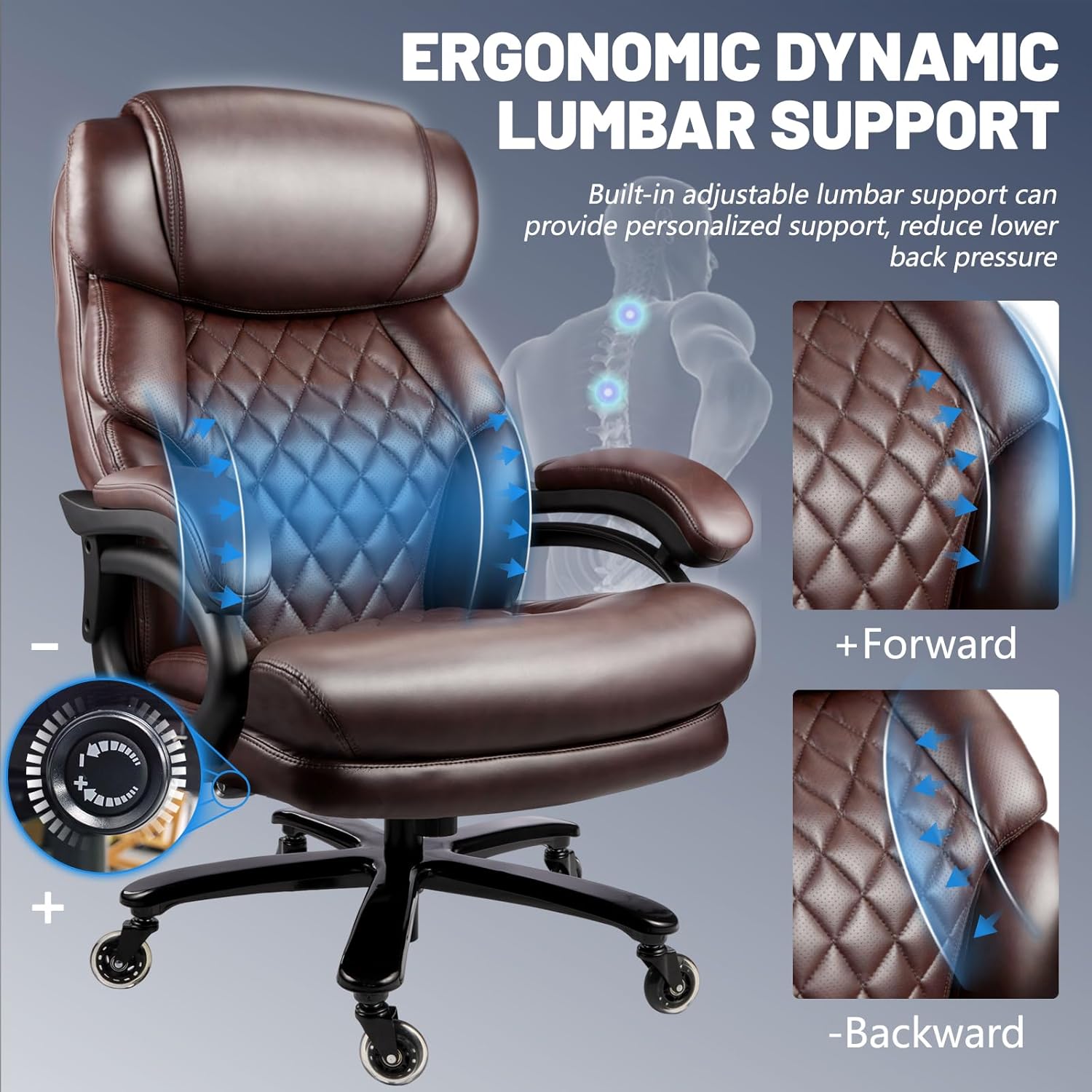 👉【Lumbar Air Support_Precision Spine Alignment】 Heavy duty chair is engineered with air-adjustable depth to mirror your spine’s natural curvature. that can be easily adjusted with the push of a button for enhanced lower back support 。Reduces back stress by 35% compared to fixed pads through dynamic pressure distribution. The reinforced PVC construction endures 60,000+ inflation cycles. Say goodbye to backpain and discover a chair that prioritizes your day-long comfort.