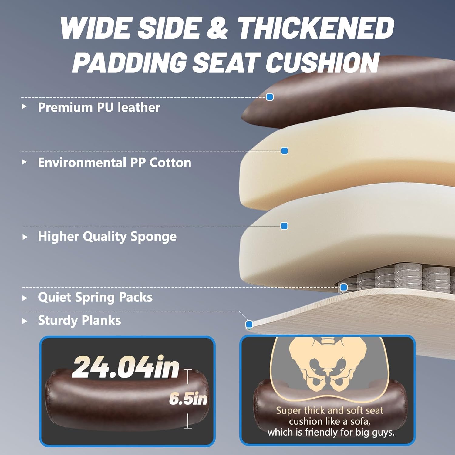 👉【Big and Tall Office Chair】Large office chair is great for big and tall people. Height adjusts from 19.7″ to 22.9″. 24.04” wide and 6.5” thick spring cushion combines 24.04” x 30.05” plus size backrest, very comfortable for you to sit on, reduce your back pain. Desk office chair is made of Premium PU leather with a blend of breathable fabric fiber mesh combines with a 3.4” spring-loaded memory foam base. Adapts to different seasonal temperatures and is warm in the winter and cool in the summer without the sticky feeling of leather.