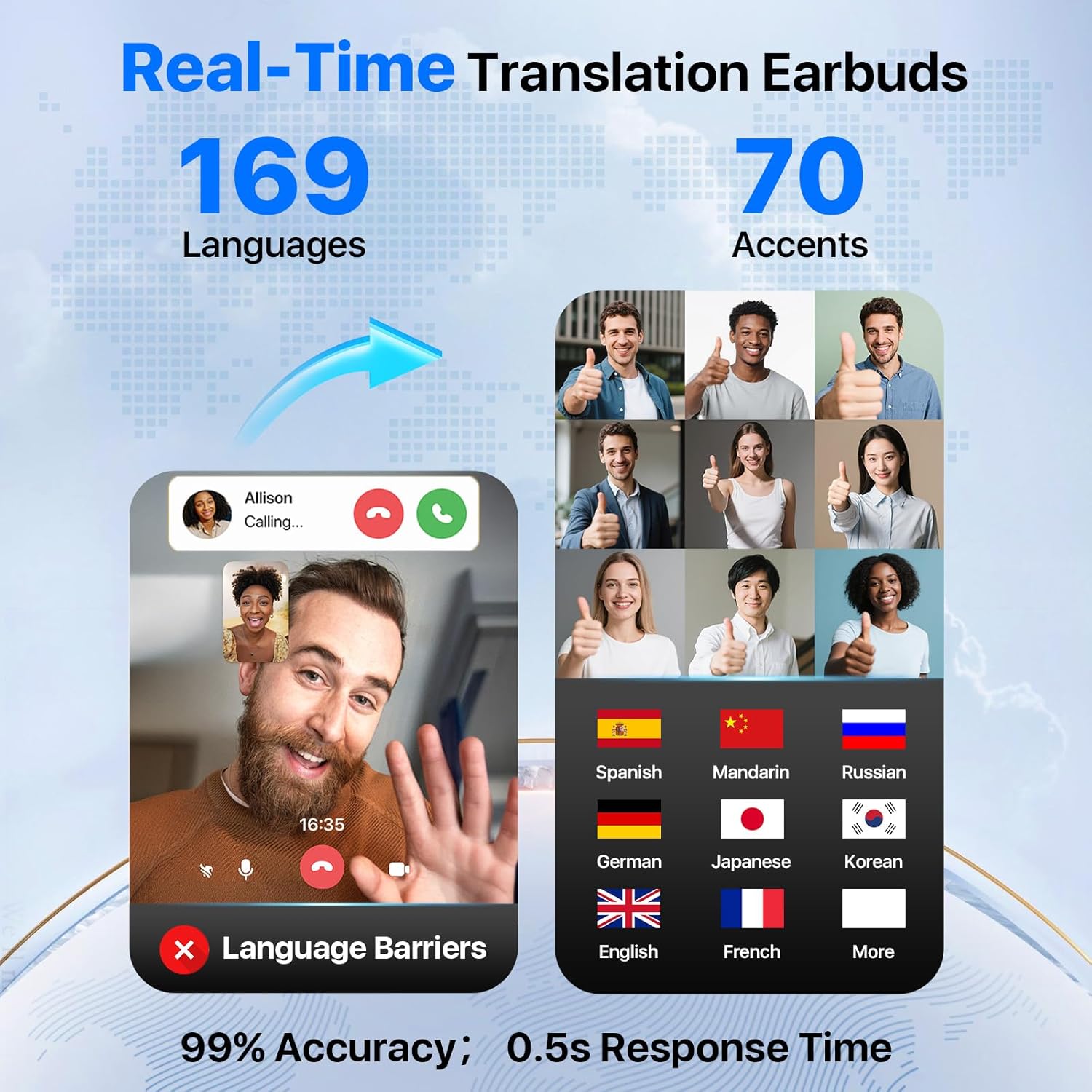 All-in-One Design: Combines translation, music playback, and call functionality, offering convenience for work, travel, and everyday life. HD Sound Quality: Delivers crystal-clear sound quality for calls, music, and translations, ensuring a premium audio experience every time.