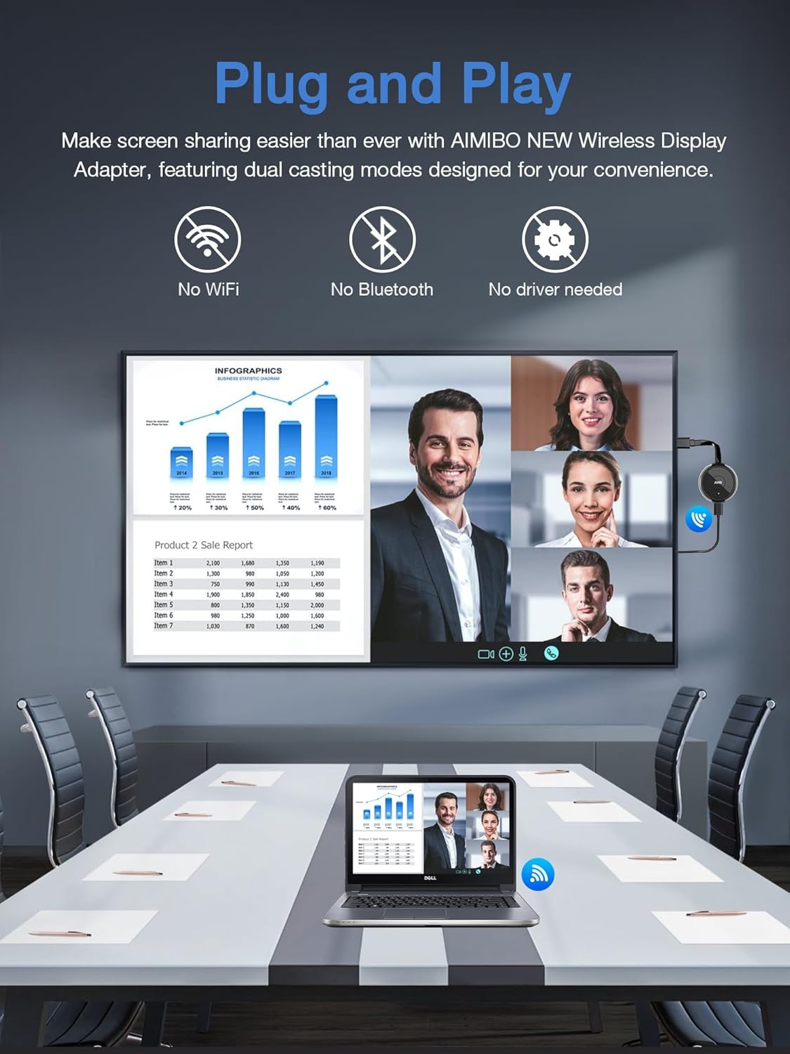 【Dual Band 2.4G & 5.8G for Uninterrupted Streaming】Unlike other wireless display adapters on the market that only support 2.4G, our HDMI wireless adapter utilizes both 2.4G and 5.8G frequencies delivering smoother and faster streaming. Whether you’re giving a critical presentation, enjoying your favorite movies, or engaging in a video conference, AIMIBO dongle ensures a stable, high-speed connection with zero latency, keeping you connected and productive in any scenario