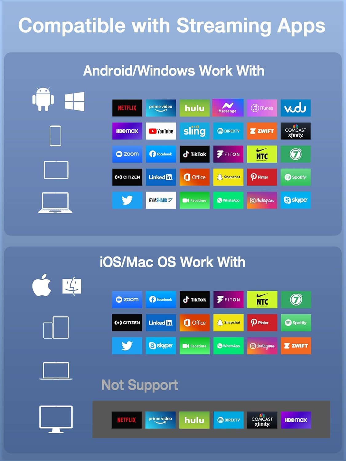 【Wide Compatibility】Compatible with most smartphones, tablets, laptops, and computers, like, iOS, Android, Windows, macOS devices. Windows makes sure it has wireless function. Supports wireless protocols like AirPlay, DLNA, Cast, and Miracast. For Windows & Android users, stream from Neflix, Prime Video, HBO Max, Hulu Plus, and more. For i-Phone, i-Pad, MacBook, mirror apps like Safari, Office, YouTube, Skype, Reddit, and other non-HDCP-protected apps
