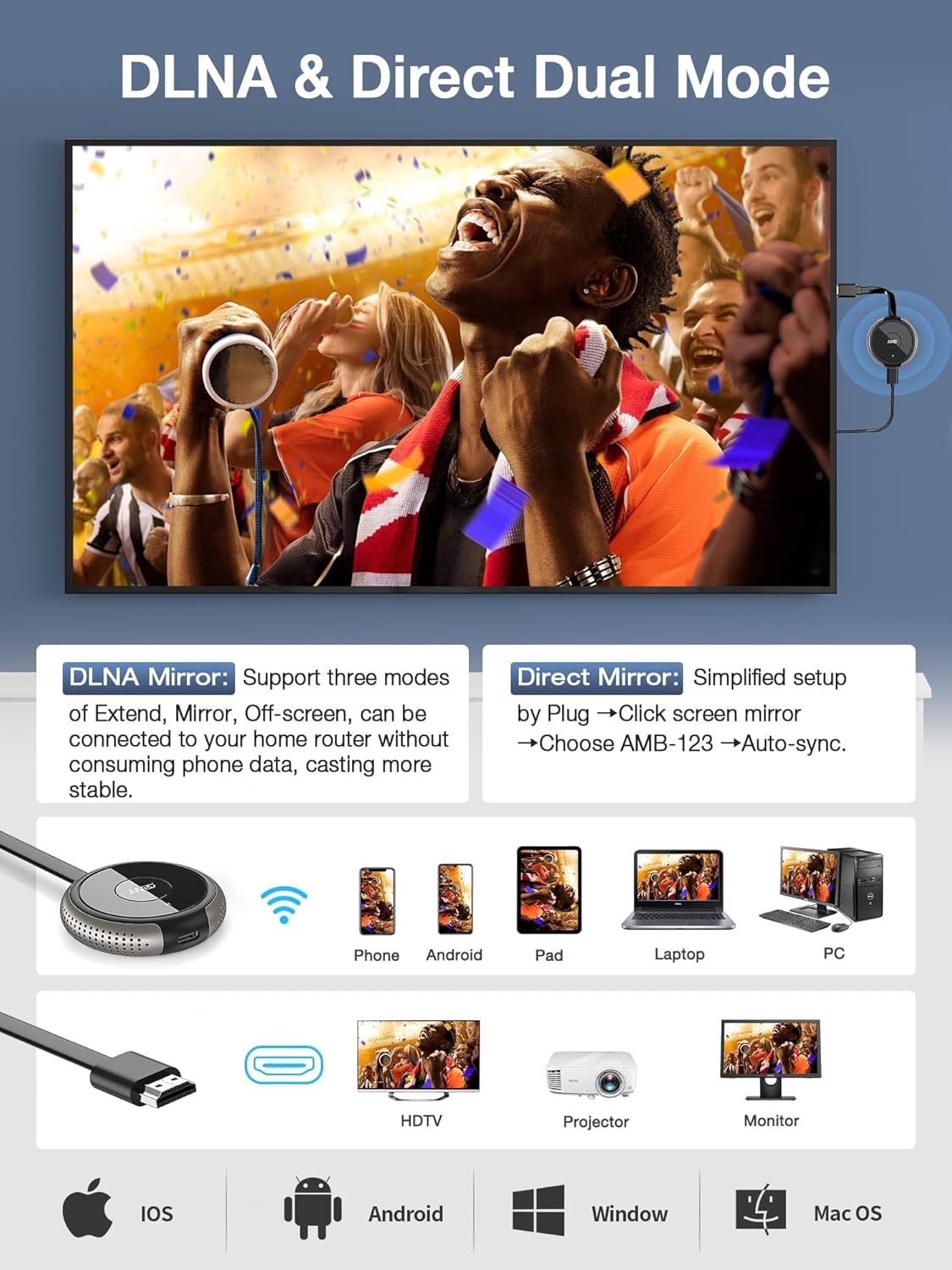 【Dual Casting Modes – Direct & DLNA Mode】Enjoy great flexibility with dual casting modes. The Direct Mirror mode is perfect for iOS and Mac OS users, allowing for instant streaming. For a more stable and extended streaming experience, use the DLNA mode with your router network