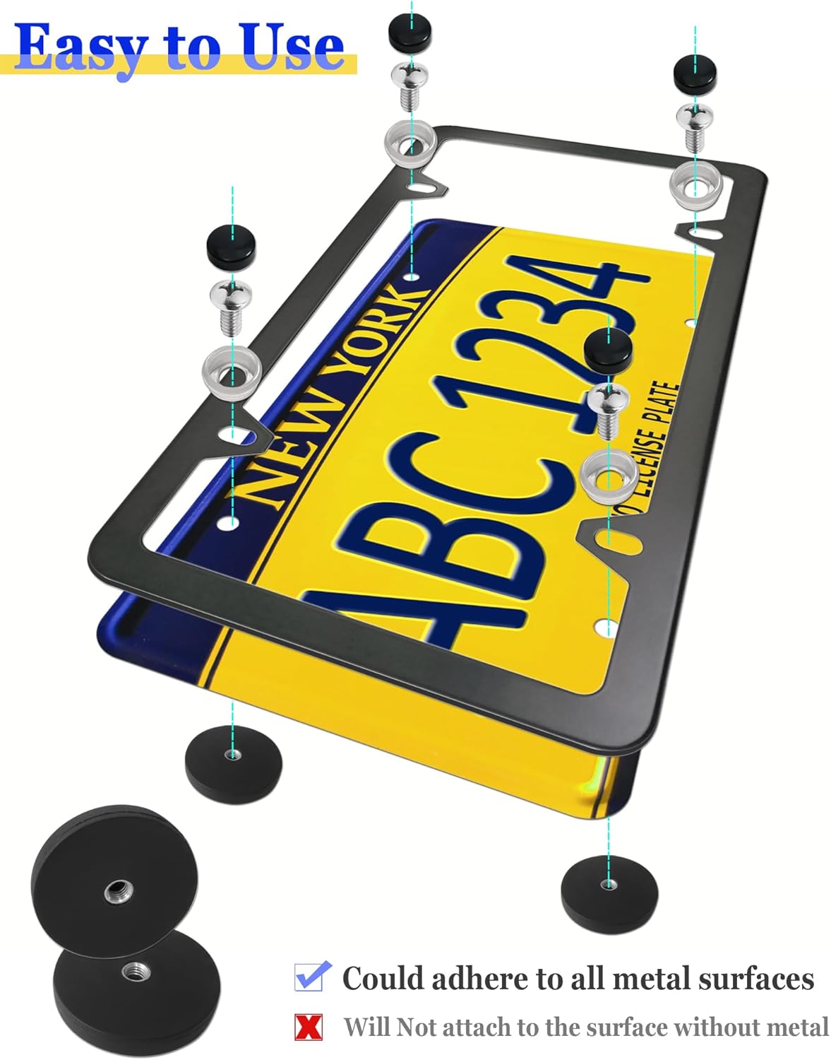 Easy to Use: Magnets with studs comes with an external thread in the center, Use the metal gaskets and screws provided in the kit to easily secure the license plate+frame to the magnet. Could adhere to all metal surfaces of the car rear truck, including trunk lids, bumpers, and tailgates. Please Notice this item will Not attach to the surface without metal
