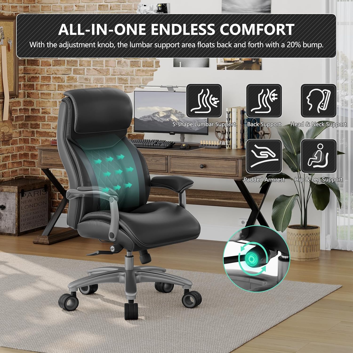 【Adjustable Lumbar Support for Long Hours】 Combat lower back strain during extended sessions at your computer! Our exclusive lumbar support in this ergonomic office chair adjusts outward 20% with a simple turn, providing deeper cushioning to contour your spine, essential for both heavy duty and big and tall users seeking all-day comfort.