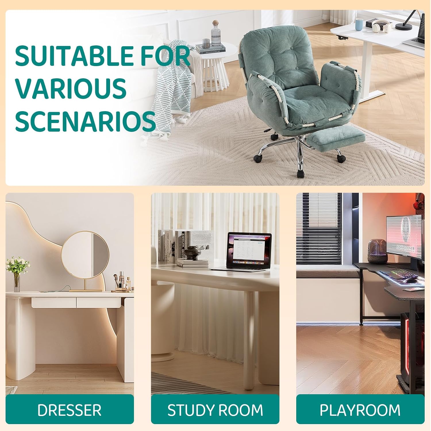 【Multi-Purpose Chair 】The chair features a retractable footrest and three-level reclining backrest, adapting to every work scenario—from office tasks to lounging or resting. It’s also a perfect match for your vanity, combining a stylish look, comfy seating, and mobility to meet all your needs.