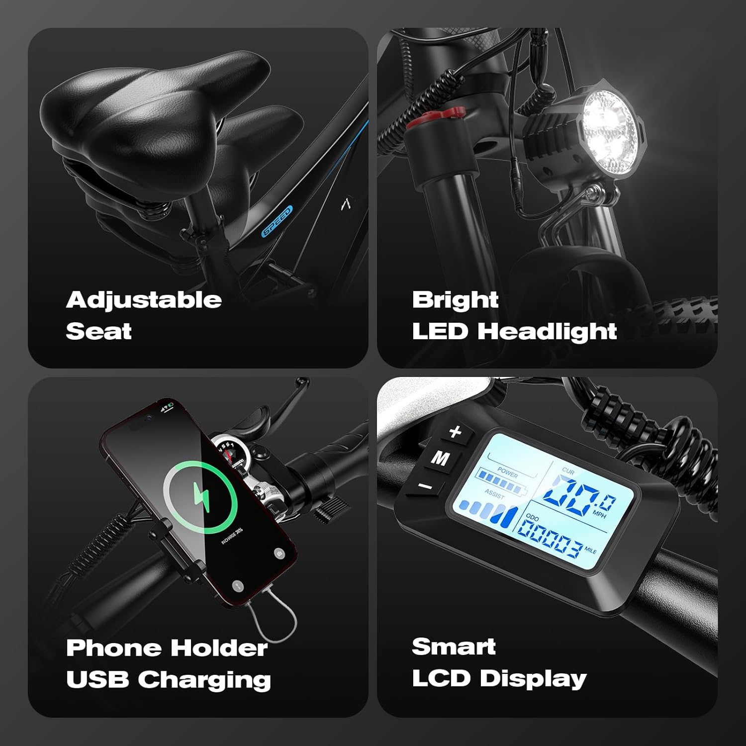 【Easy Assembly】This e bike for adult comes with a pre-attached rear wheel, front wheel, handlebars, saddle, fenders, pedals, phone holder with USB charger, headlight, charger, installation tools, and a user manual. Easy to assemble, you’ll be riding your new ebike in no time. Enjoy peace of mind with a 12-month customer support. This electric bicycle for adults is designed for those who value quality and reliability