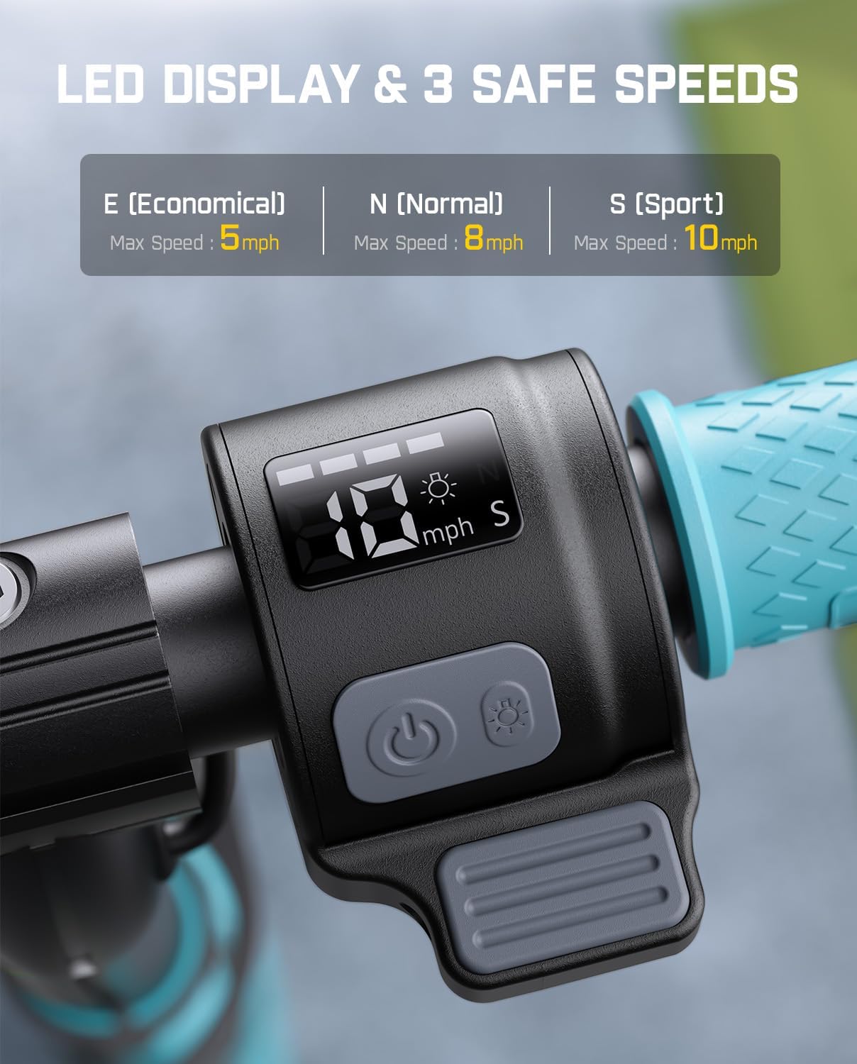 Versatile Speed & Battery Display: The electric scooter for kids offers three speeds(5 mph/ 8 mph/ 10 mph) selections that are very suitable for children. The LED display shows the battery power, pedal mode, and riding speed at any time