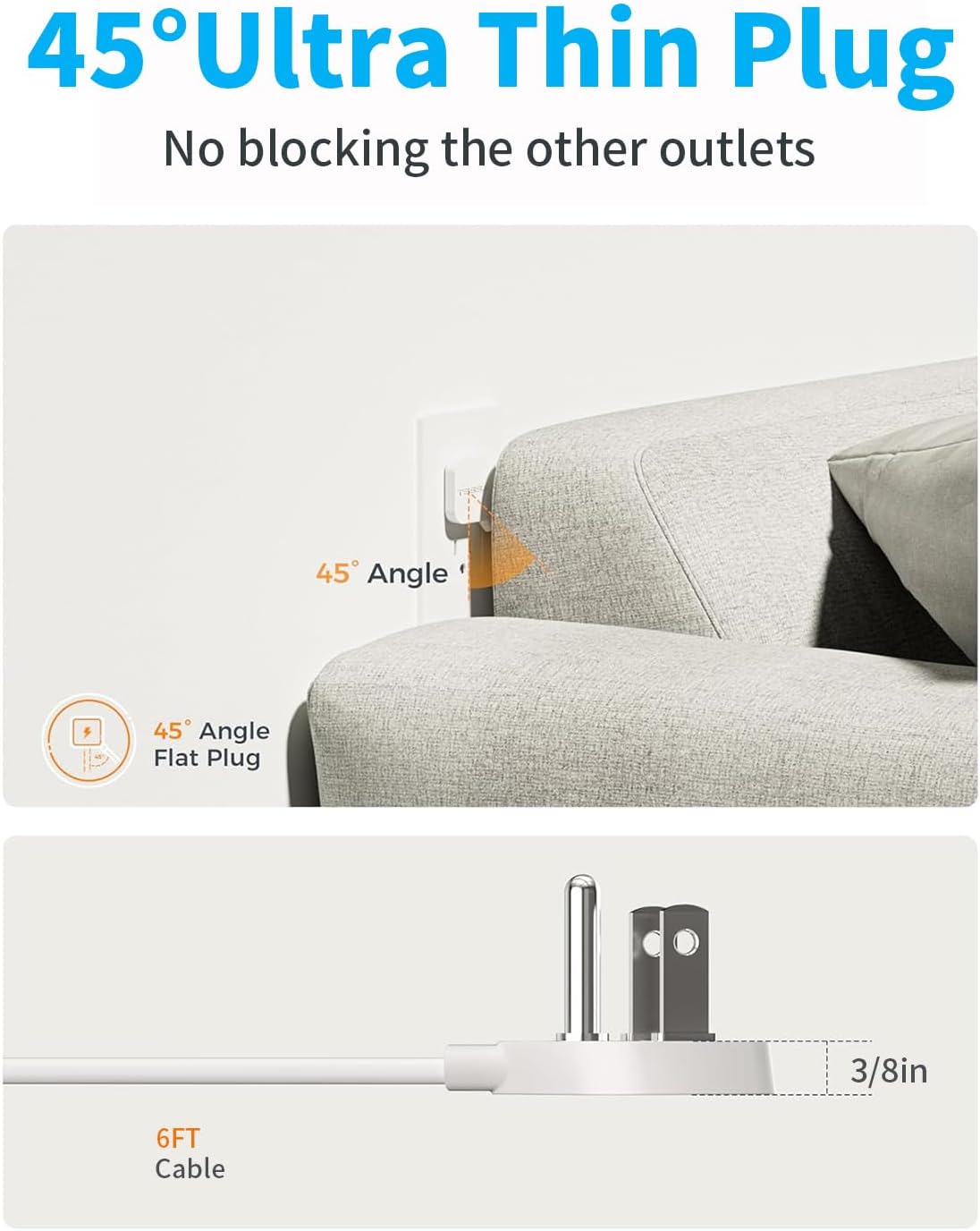 🏠【Space-Saving Flat Plug】The ultra-slim flat plug sits flush against walls. It can close to the wall easily, and hide in the back of furniture, bed or refrigerator, maximizing every inch of space in your home.The 45 degree right angle design create additional space for other plugs.