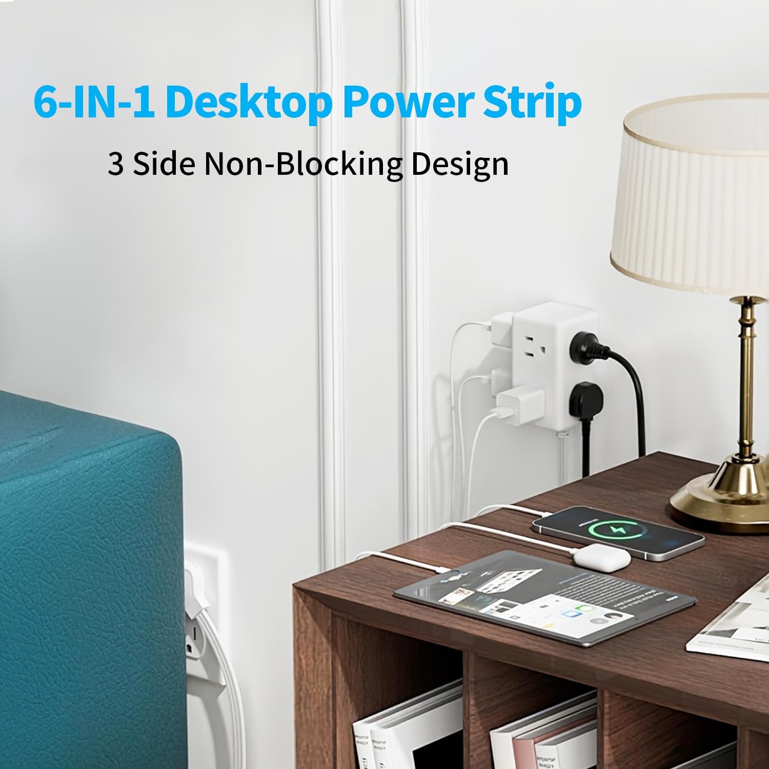 🔌【6 Outlets on 3 Sides】This space-saving flat plug power strip features 6 AC outlets distributed across three sides, making it easy to plug in multiple bulky adapters without blocking each other. Ideal for tight spaces, clutter-free desktops, nightstands, or any area.