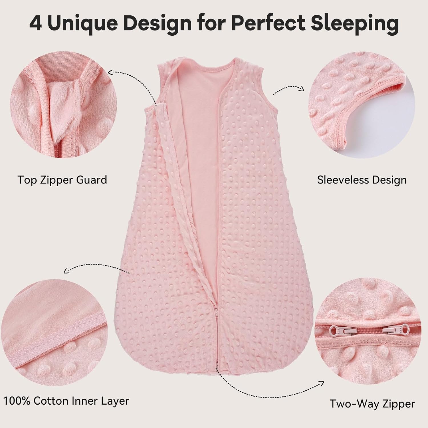 Soothing Dots Design – The fleece sleep sack with raised dots resemble mom’s touch, giving your baby a familiar sense of security and soothing baby to sleep through the night. Suitable for temperatures between 69-73°F (21-23°C), this 1.5 tog sleep sack creates a warm and cozy environment for your baby.