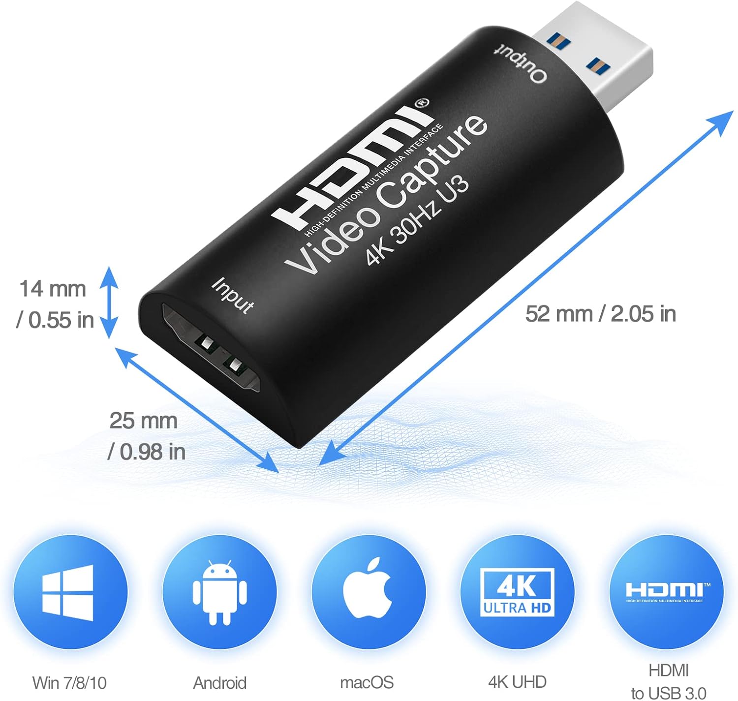 【Max 4K@30fps Input & 1080P@60fps Full HD Output】 HDMI Video Capture Card input supports max resolution 4K@30fps. And output supports up to 1080P@60fps. USB video capture card support AWG26 HDMI standard cable input up to 15 meters. Audio Capture Card fits for devices with HDMI output port like PC, laptop, Switch, PS4/5, Xbox…etc. Also, you may output videos/contents from phone/tablets via cables with HDMI adpaters.