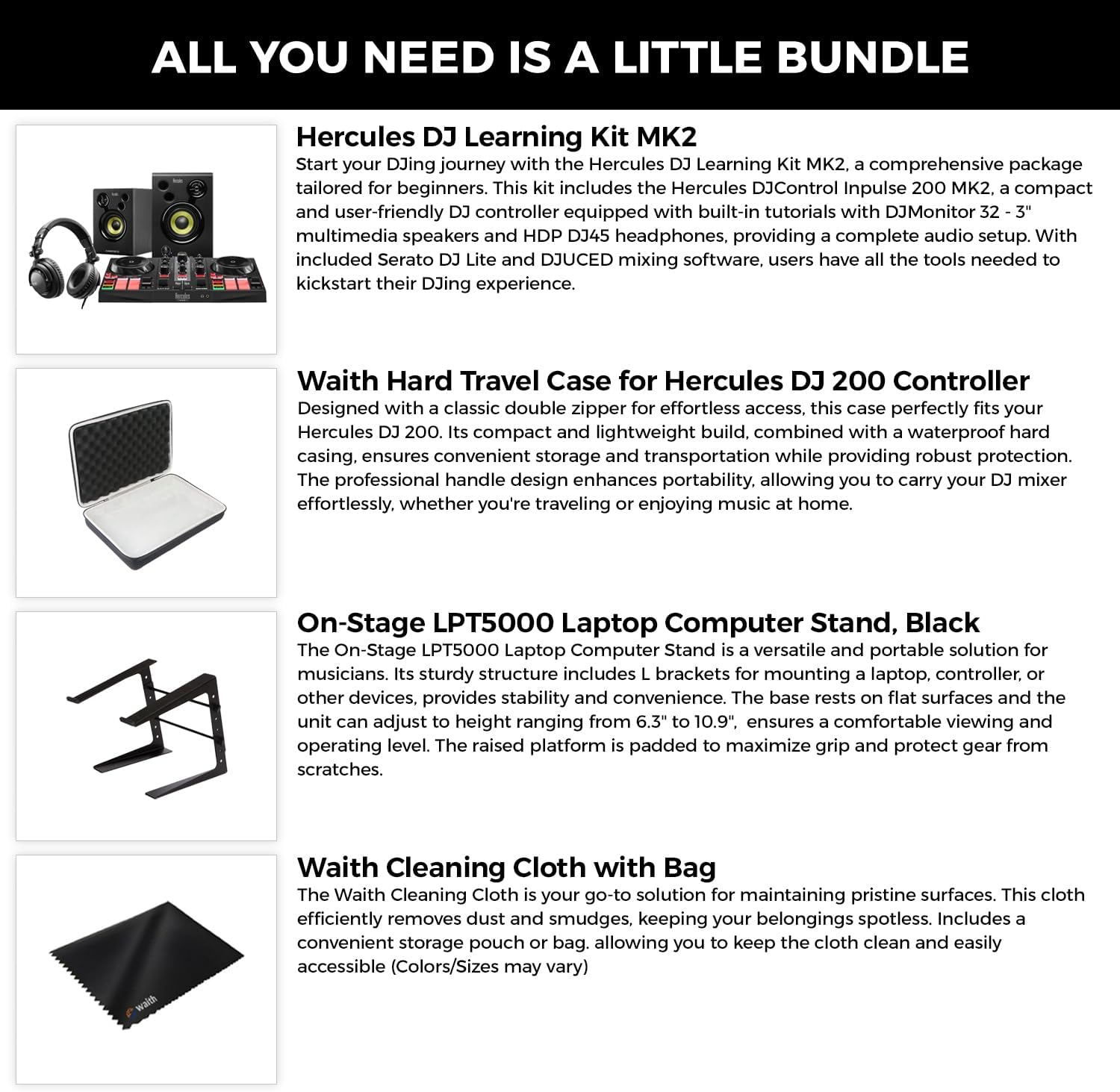 Bundle Includes: 1 x Hercules DJControl Inpulse 200 MK2, 1 x Braided USB Cable, 1 x Serato DJ Lite Software, 1 x DJUCED Software, 1 x Hercules DJMonitor Multimedia Speakers (Pair), 1 x Power Cable, 1 x Satellite Connection Cable, 1 x Hercules HDP DJ45 Closed-Back, Over-Ear DJ Headphones, 1 x 1/4″ Adapter, 1 x Waith Hard Travel Case, 1 x On-Stage LPT5000 Laptop Computer Stand, 2 x Top L Brackets, 2 x Bottom L Brackets, 2 x Stabilizer Bars, 4 x Screw Knobs, 1 x Microfiber Cleaning Cloth