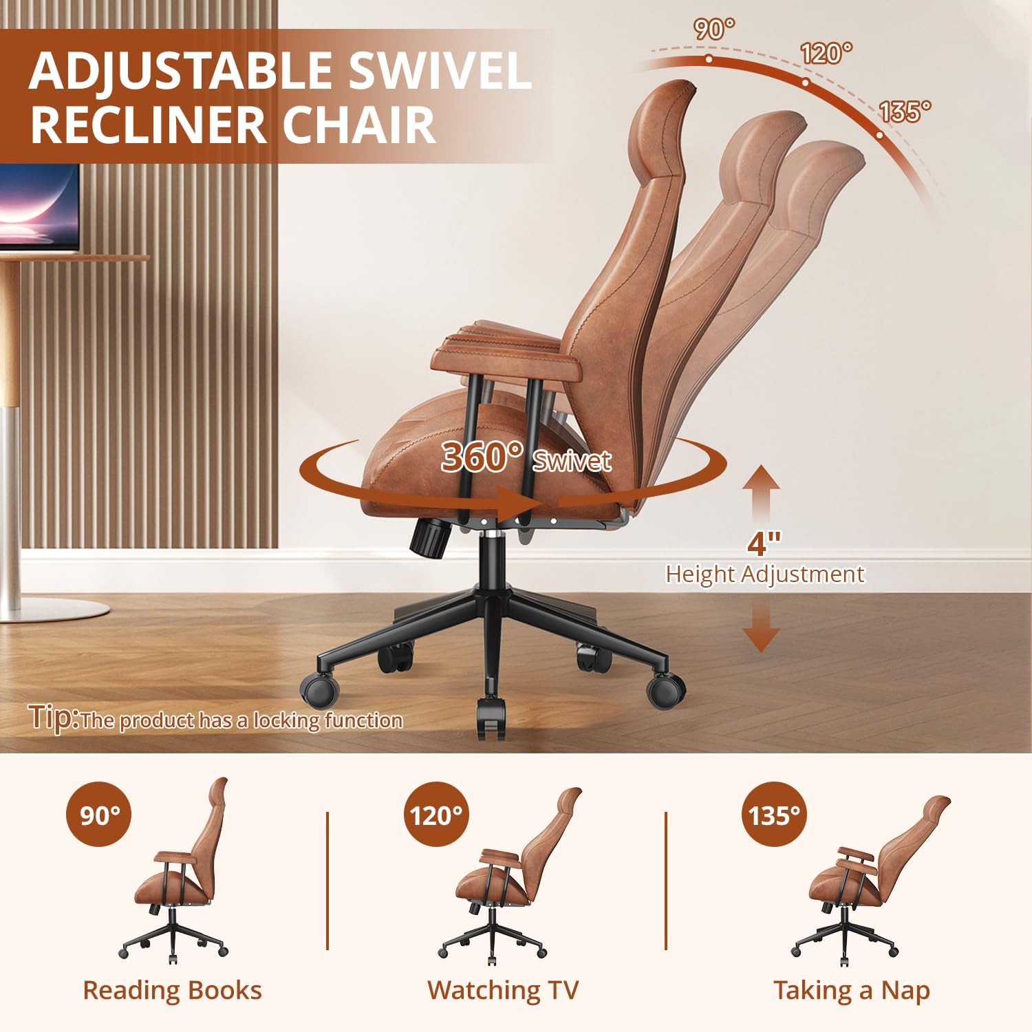 Adjustable Recline with Locking Feature: This ergonomic office chair reclines up to 135° with a secure tilt lock, offering flexible positioning for working, reading, or relaxing. Adjust the tension to find your perfect angle for all-day support.