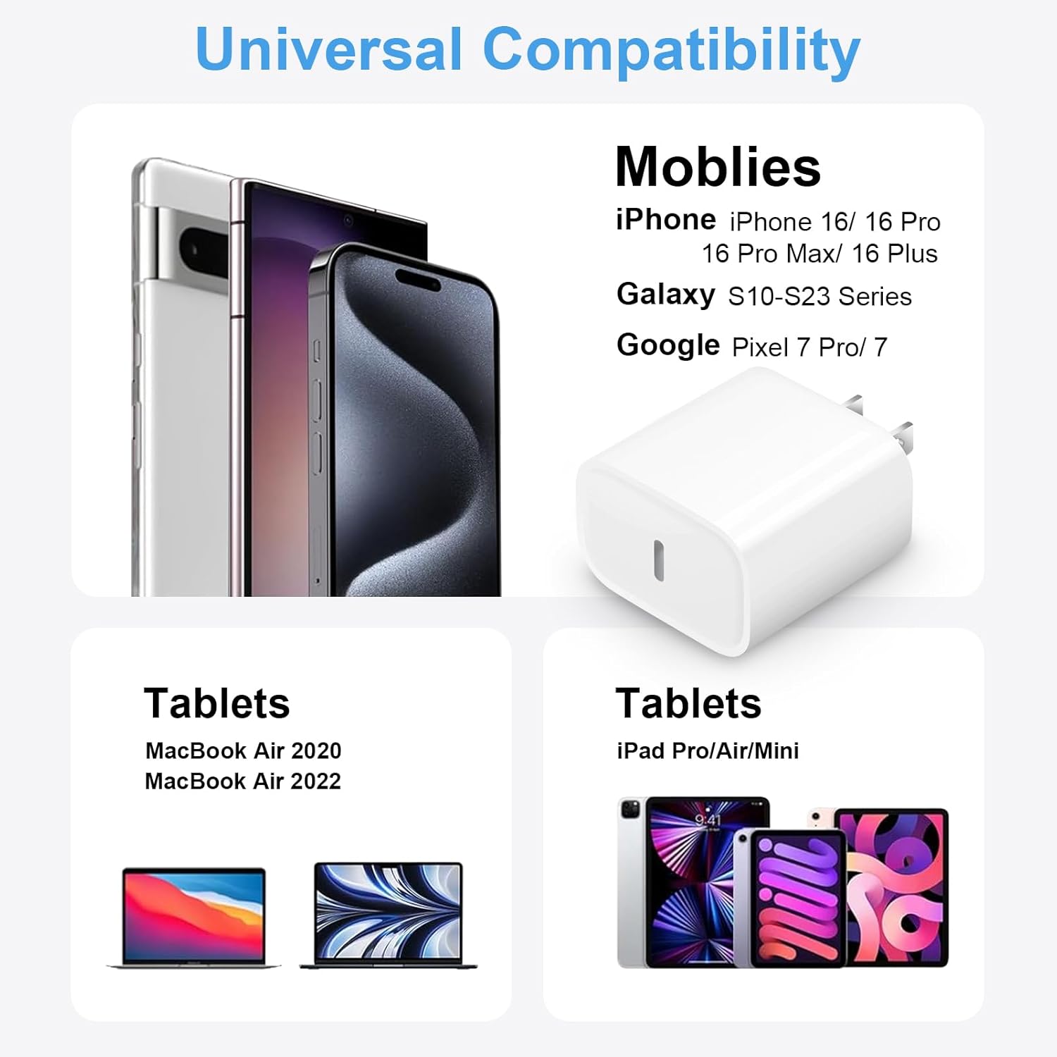 [Fast charge iphone 16/15] This fast charging sets included 3 Pack 20W PD wall chargers and 3 Pack iPhone fast charging cables,which can be used separately. Compatible withiPhone 16/16 Pro/16 Pro Max /15/15 Plus/15 Pro/15 Pro Max, iPad Pro 12.9 inch 6th/ 5th / 4th/ 3rd, iPad Pro 11 inch 4th/ 3rd/ 2nd/ 1st, iPad Air 5/4th, iPad Mini 6th, iPad 10th Generation; MacBook Air M1 M2; and other USB-C enabled devices