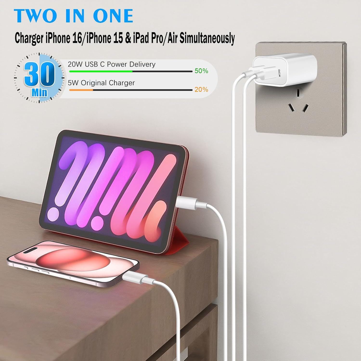 -For iPhone 16/iPhone 16 Pro/iPhone 16 Pro Max/iPhone 16 Plus/iPhone 16e-For iPhone 15/iPhone 15 Pro/iPhone 15 Pro Max/iPhone 15 Plus-For iPad Pro 13-inch (M4), iPad Pro 11-inch (M4)-For iPad Air 13-inch (M3), iPad Air 11-inch (M3)-For iPad Air 13-inch (M2), iPad Air 11-inch (M2)-For iPad Mini A17 Pro/Mini 6th-For iPad Pro 12.9-inch(6th/5th/4th/3rd Gen) 2022/21/20/18-For iPad Pro 11-inch(4th/3th/2nd/1st Gen) 2022/21/20/18-For iPad Air 10.9-inch(5th/4th Gen) 2022/20-For iPad A16 11th/10th Gen 2025/2022-Other devices that support USB Type C-port chargingThe product includes:2 x iPhone 16 Dual USB C Ports PD Fast Charger Plug2 x iPhone 16 USB C to C Cable(10Feet/3M)
