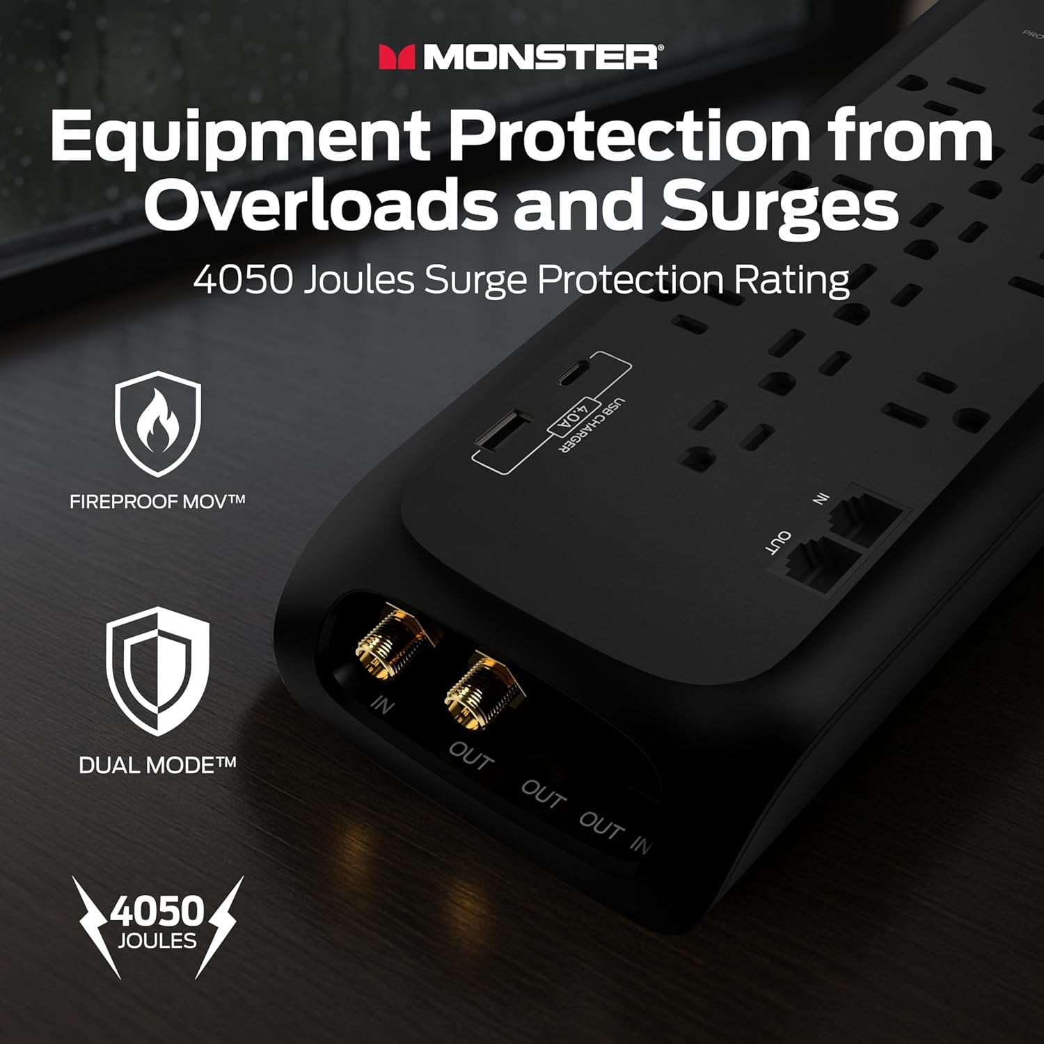Monster Power Surge Protector w/ 4050 Joule Rating — Heavy Duty 6 FT Surge Protector Power Strip w/ 12 Outlets, 2 USB, 2 Coax, 2 Ethernet Ports — Fireproof MOV, Dual Mode, Clean Tech (Black)