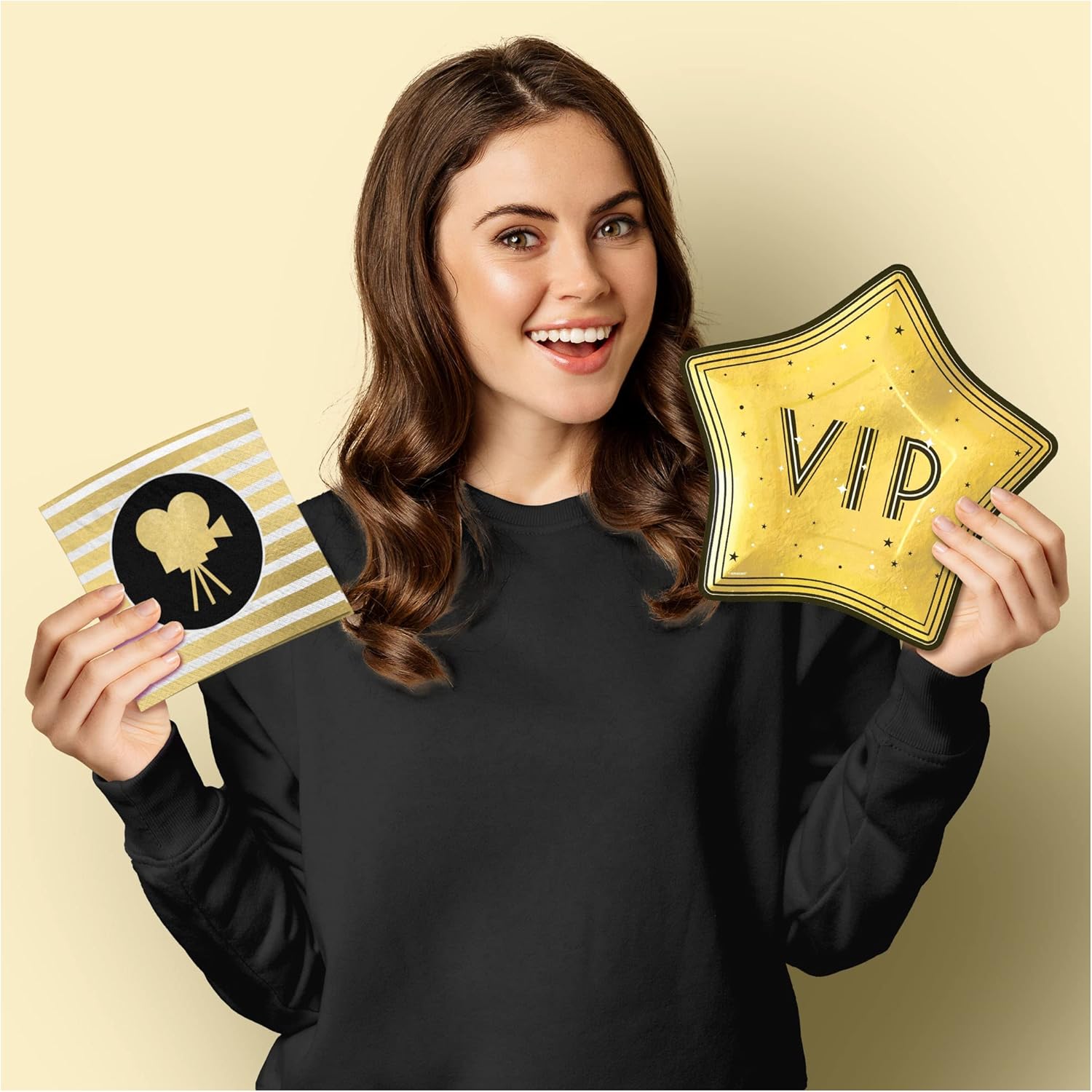 Features “VIP” gold star shaped plates and “Lights, Camera, Party!” napkin with gold accents.