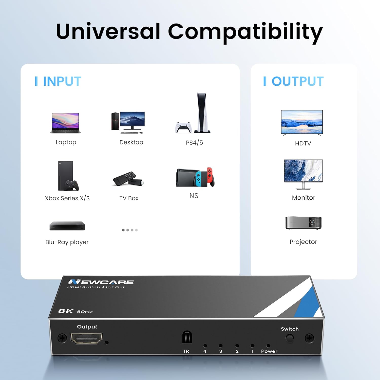 [Included in the Package] 8K@60Hz 4 port HDMI switch, remote control, user manual, power cord. HDMI splitter 4 in 1 out is compatible with NS, PS5, XBOX, Fire Stick, Roku, 4K high refresh rate TV, and 8K TV.Includes power cable for stable signal transmission and reduced flicker, especially under high-resolution formats like 8K, avoid using HDMI cables longer than 10 feet (3 meters).