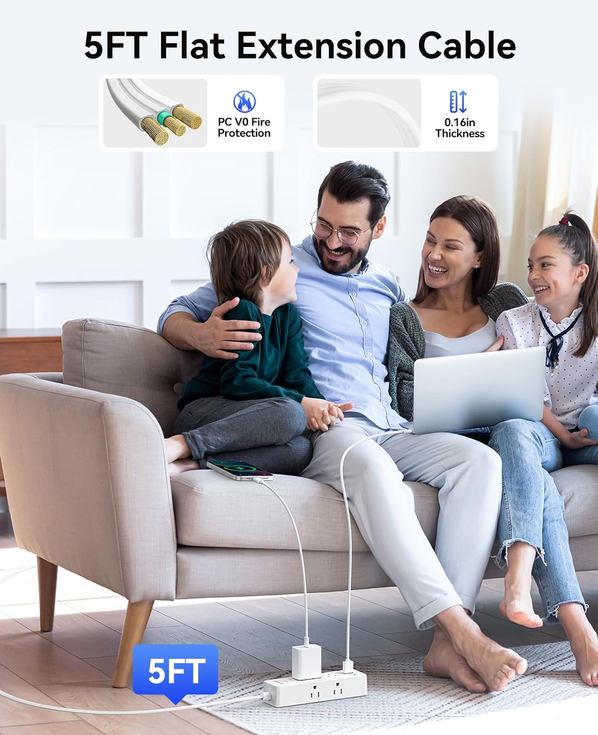【5 Ft Extension Cord & Ultra Flat Plug】The power strip has 5ft extension cord (just 4mm thin), enables the power strip to be positioned more conveniently against walls or furniture, optimizing space utilization. The super-slim plug (only 0.35 inches thick) easily tucks behind furniture
