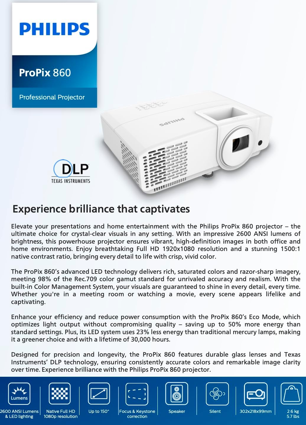 Designed for precision and longevity, the ProPix 860 features durable glass lenses and Texas Instruments’ DLP technology, ensuring consistently accurate colors and remarkable image clarity over time. Experience brilliance with the Philips ProPix 860 projector.