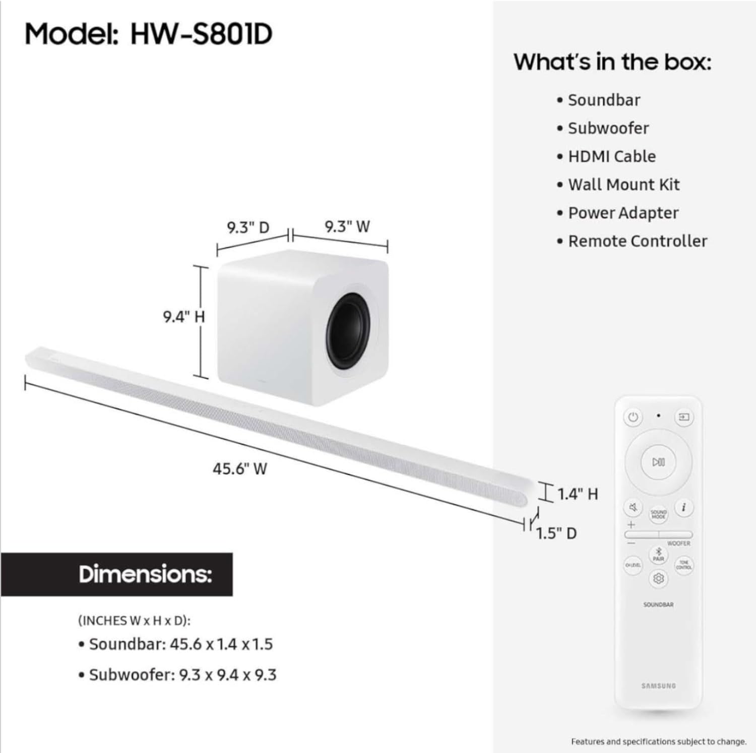 IN THE BOX: : Samsung HW-S801D 3.1.2ch Wireless Soundbar Dolby Atmos, White (2024) | Remote Controller | Wall mount kit | HDMI Cable | Power Adapter | Deco Gear CPS Exclusive 26 Months Premium Extended Service Protection | Deco Gear 4K HDMI 2.0 Cable w/Pure Copper Conductors x2