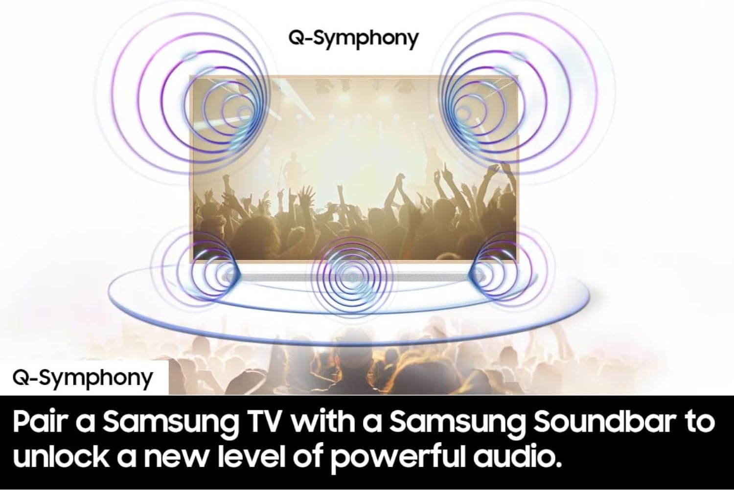 Q-SYMPHONY: Pair a Samsung TV with a Samsung Soundbar for a new level of powerful audio; Experience content like never before only with Samsung products; With Q-Symphony, your speakers work together to optimize all audio channels to operate as one