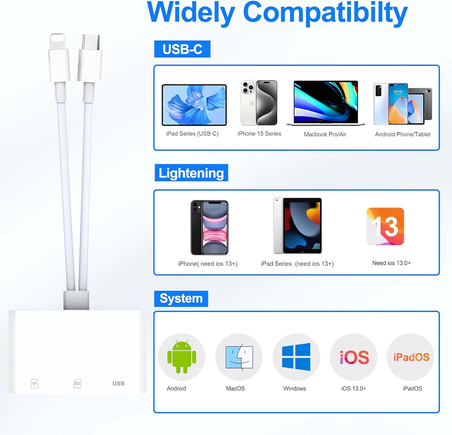 -This Memory card reader compatible with apple iphone 5-14, usb c iphone 15-16, ipad/ipad pro/ipad mini/air, mac, macbook/macbook pro,imac M1 M2 also compatible with Samsung/Galaxy/Dell/Thinpad and other Android phone/tablets/laptop with USB-C Type C connector.