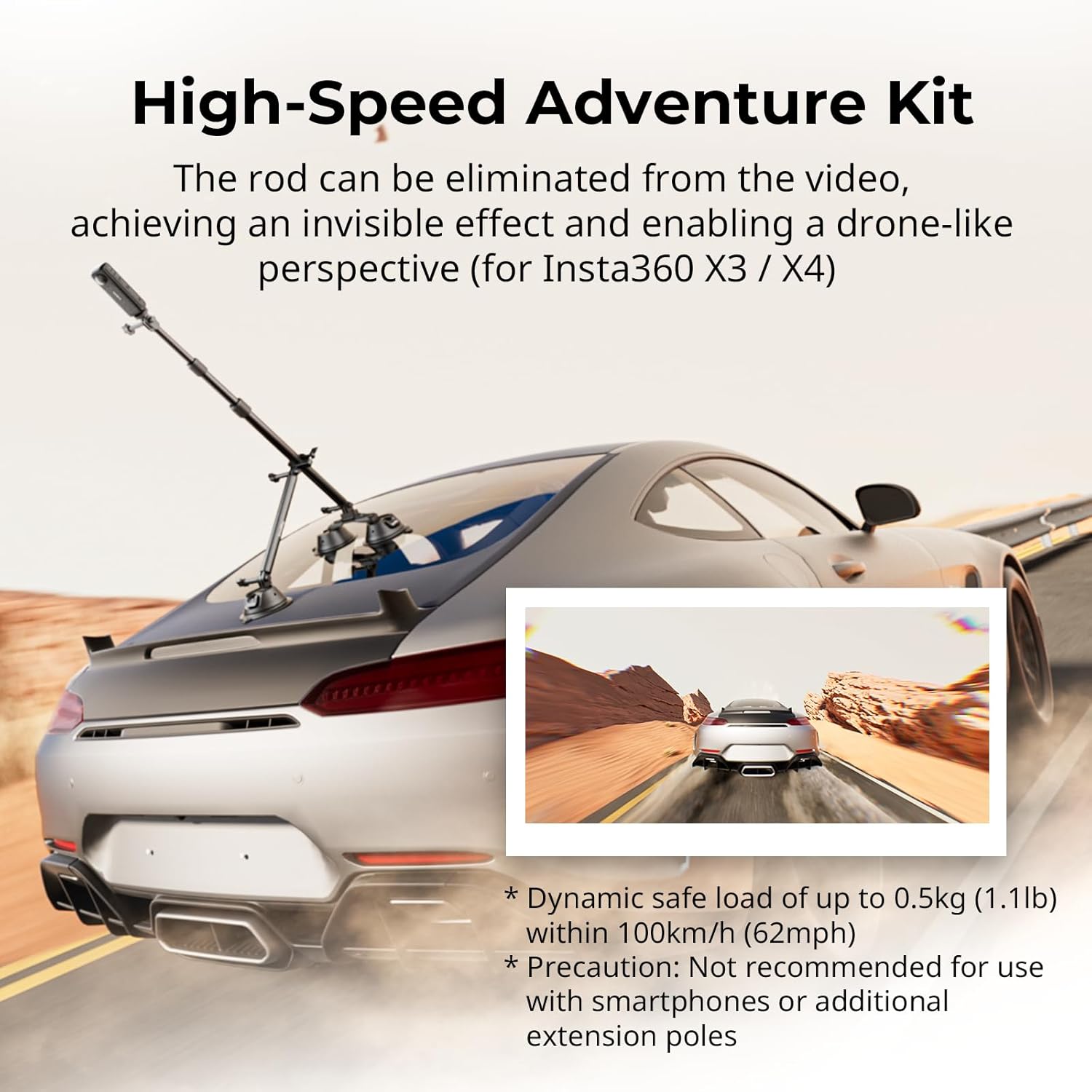 Compatibility: Specifically designed for high-angle car filming with action cameras, with a dynamic safe load capacity of up to 0.5kg (1.1lb), covering the majority of action cameras. For Insta360 X5/X4/3, for GoPro 12/11/10, for DJI action 4/3, etc.