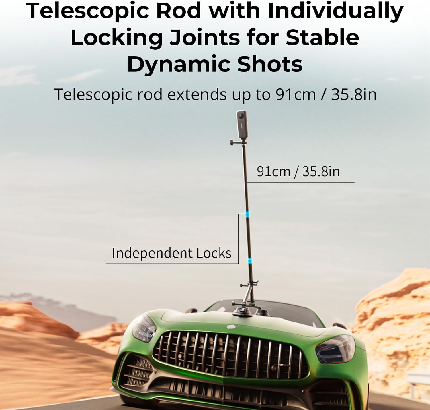 Drone Perspective: The telescopic rod extends from 28cm (11in) to 91cm (35.8in) and features a knob-locking mechanism in each section for steady and dynamic shooting. When paired with the panoramic camera (for Insta360 X5/X4/X3), effectively conceals the selfie stick to achieve a low-altitude drone-like shooting perspective.