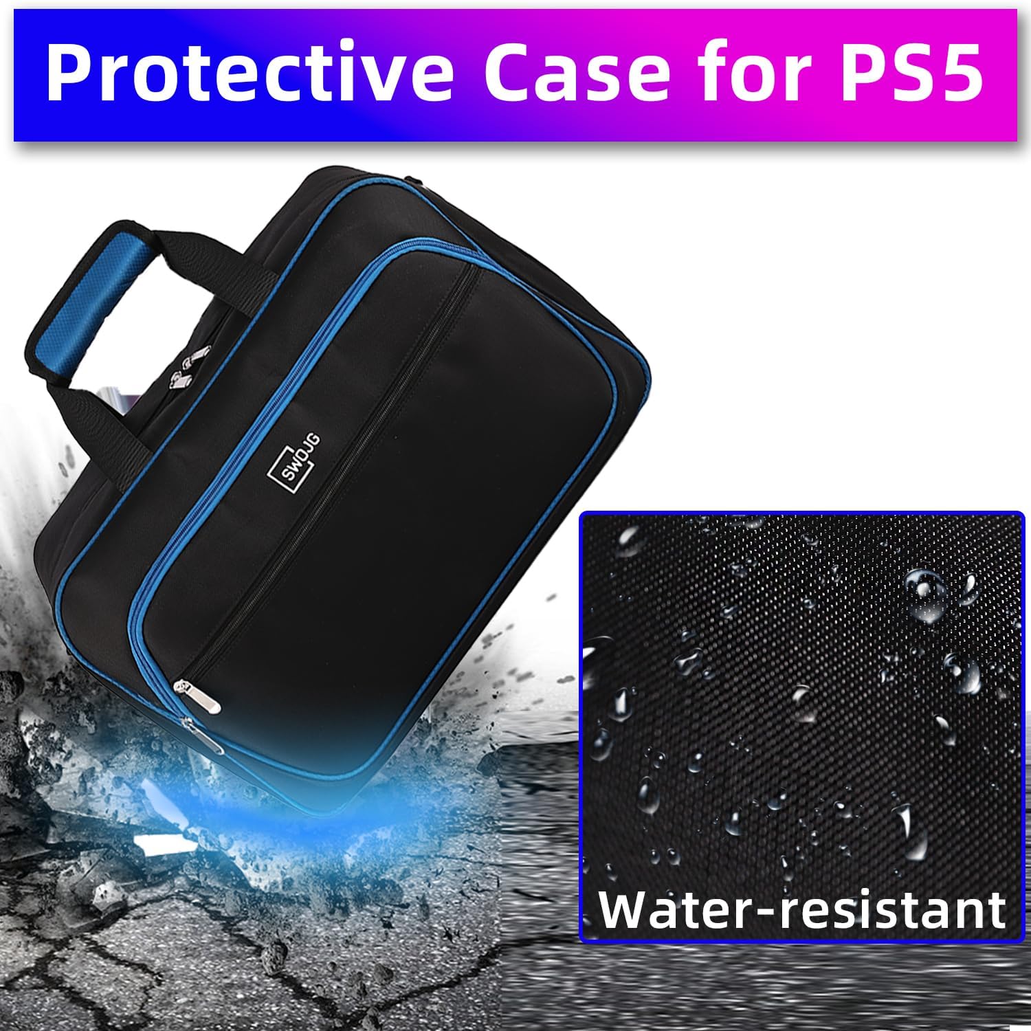 Thoughtful Protection: Travel bag for PS5/PS5 Pro is made of water-resistant material to resist light rain and scratches. The main compartment has 2 fixing straps, padded and soft velvet lining in the sidewall, and 4 thick rubber pads on the bottom, which will reduce the collision during carrying way. Double-zipper design is easy to put in and take out the game machine and accessories. Carry case for PS5 keeps your game machine secure everywhere