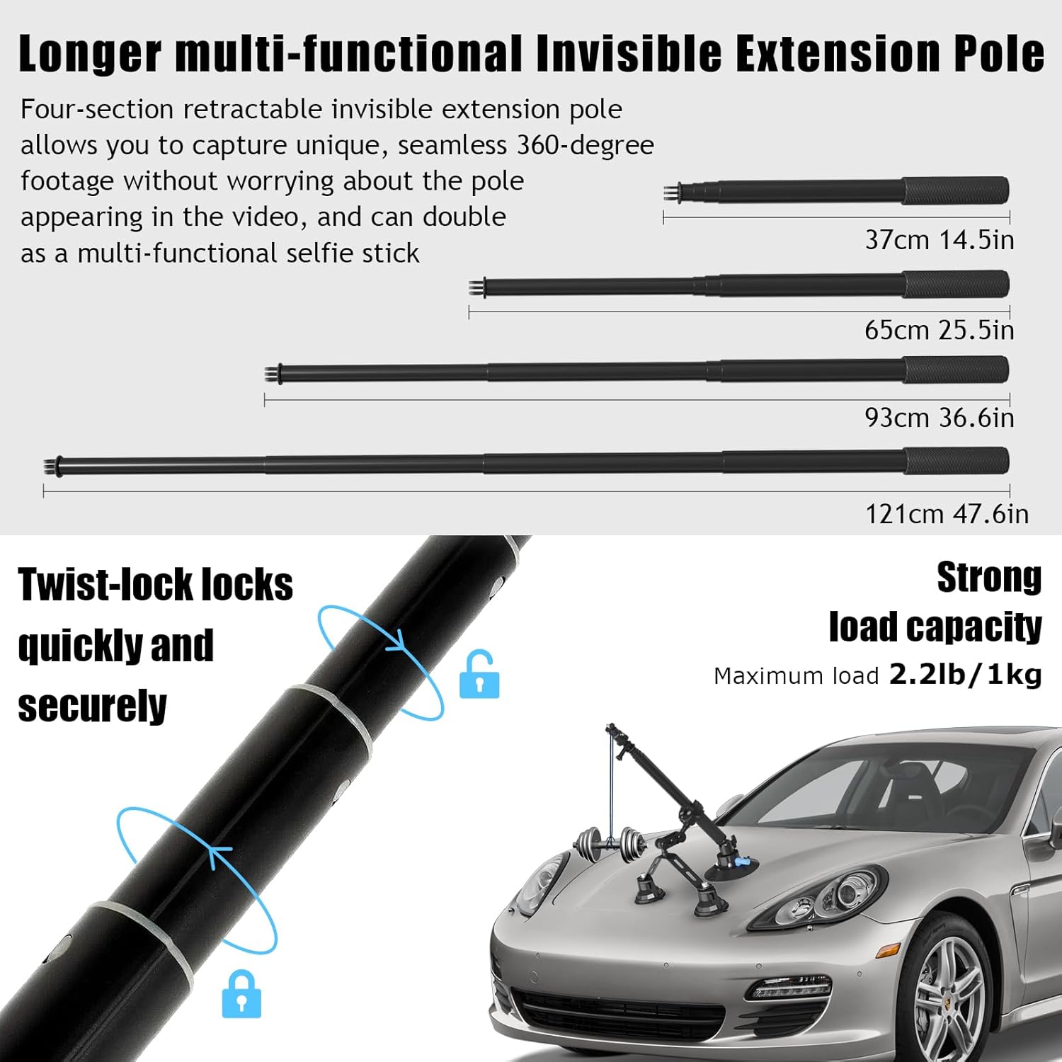 Invisible selfie stick is a cool extra feature, and this flexibility allows for a range of shooting angles and perspectives.60-inch invisible extension pole can be adjusted to your desired length, giving you the freedom to easily shoot wide-angle shots or close-up selfies without the stand showing in the shotTwist-lock structure, made of aluminum alloy, can support up to 11 lbs/5 kg. When the pole is extended to its longest length, the load capacity is 2.2 lbs/1 kg. It comes with an action camera adapter on the top