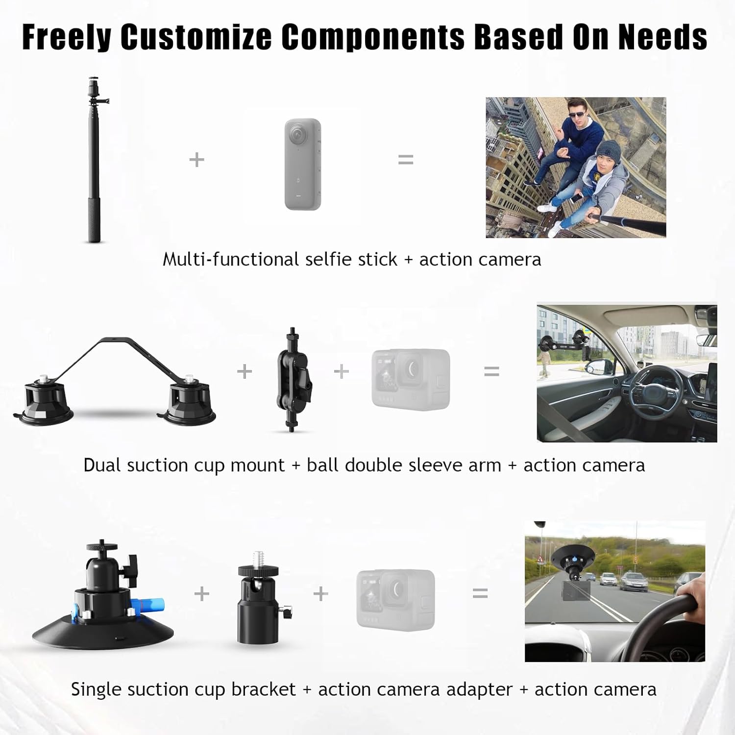 【Flexible Use】 The dual suction cup mount is connected by a U shaped bracket, allowing both combined and standalone use, The single suction cup mount enables 180° front and back adjustments with the thumb screw, catering to diverse shooting needs. Used it to video the front end of your truck over crazy off road stuff, make Google Street View videos or have this mounted on the drift car to catch some great 360 videos!