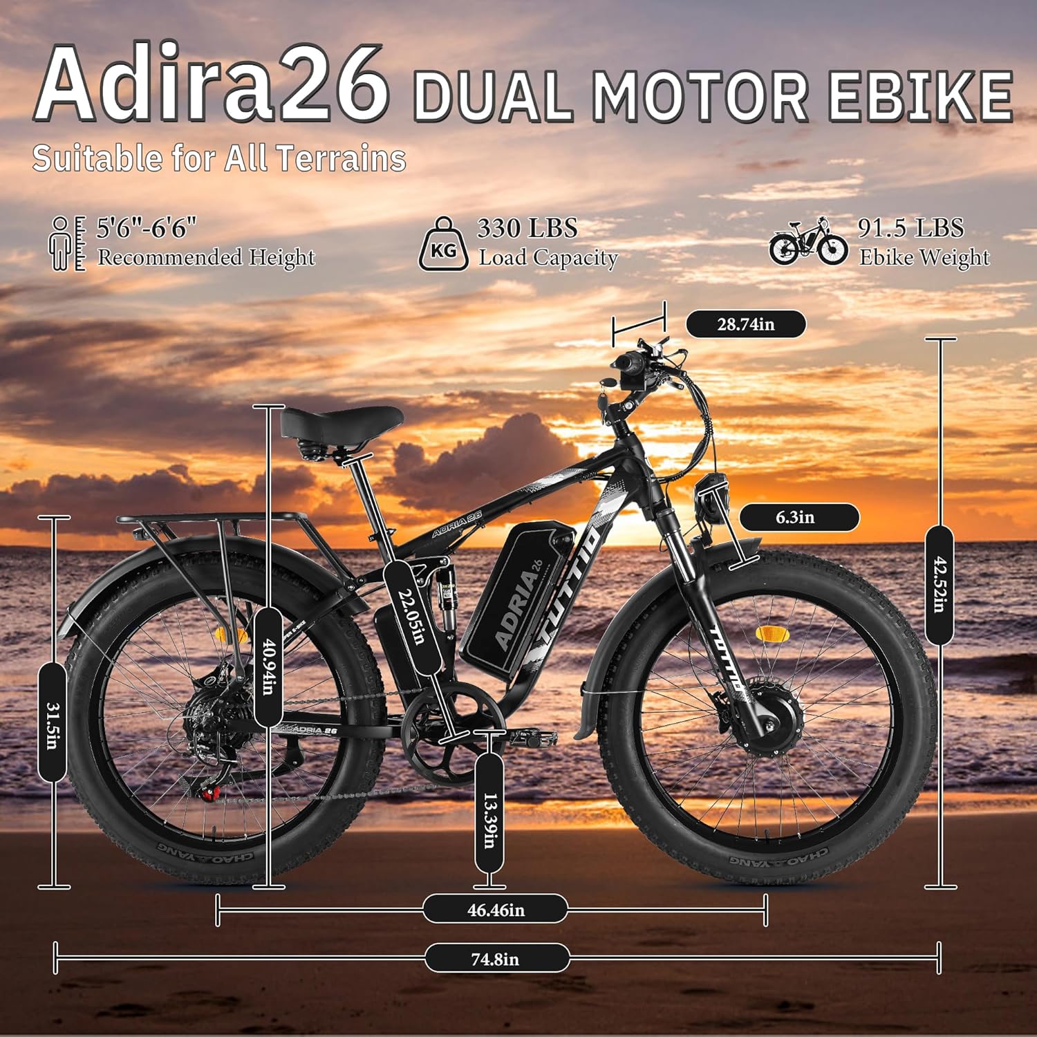 🚲【Powerful Dual Motor Ebike】Tuttio adria26 electric bike for adults is powered by 2 high-performance motors, which together provide an amazing power, as well as a high torque of 210N·M, taking you to tackle all terrain and climb 45° uphill easily. It can reach up to 46MPH without load, and can basically reach 40MPH when responsible for 165LBS, which is an ideal choice for thrill seekers and daily commuters.