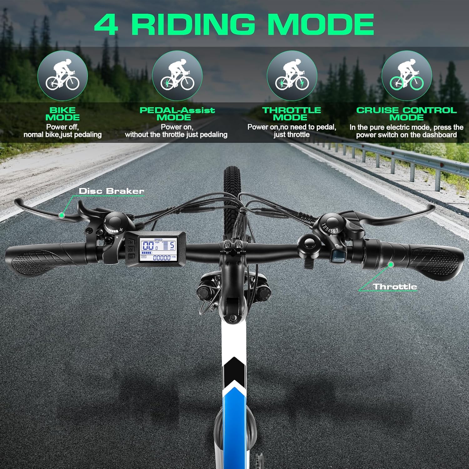 【5 WORKING MODES】The vivi e-bike provides five working modes. PAS Mode: The motor will assist you with a moderate amount of power as you pedal the bike. Pure Electric Mode: Twist the throttle in any increments of power you desire. Pedal Mode: Pedal the bike normally as you would any bike. Cruise control mode: The electric bike will switch to the cruise control state and keep riding at the original speed. Walk Assist mode: The motor will help you push the ebike, especially when going uphill