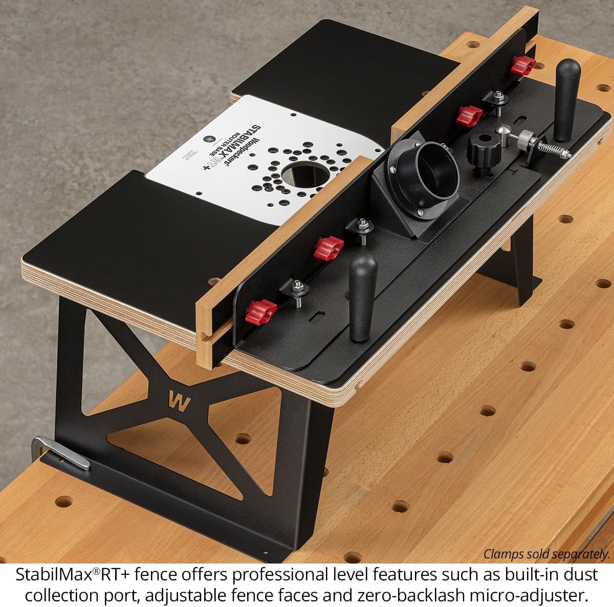 The table’s precisely machined opening, rubber bumper grip, and direct-milled fence slots ensure strength and accuracy beyond competitive designs. The adjustable MDF fence faces allow for perfect zero-clearance setups, while the dust collection port improves efficiency. Whether clamped to your bench or freestanding with legs, StabilMaxRT+ adapts to your workflow.
