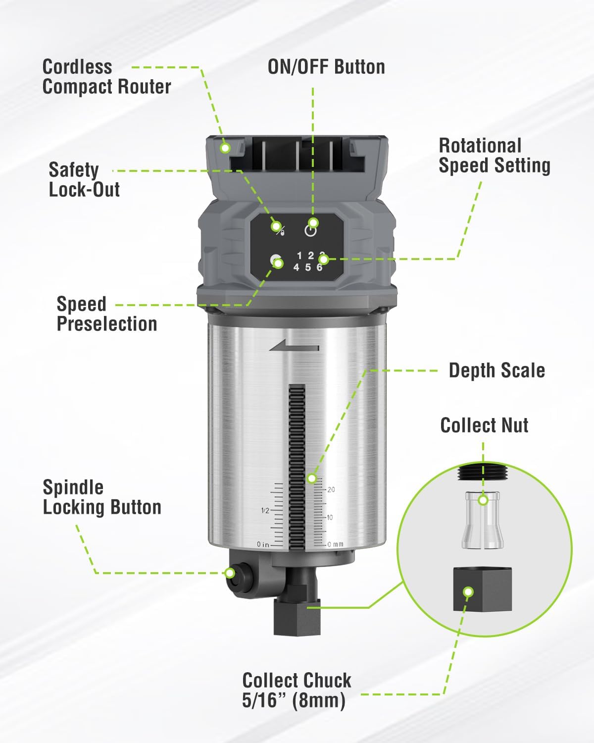 6-Speed Variable Control for Versatile Use: The WORKPRO 20V cordless compact router tool features adjustable speeds from 10,000 to 30,000 RPM, allowing you to select the optimal speed with the 6-speed button to match different materials and tasks. Enjoy smoother cuts, less tear-out, and pro-quality finishes for both light and heavy-duty jobs